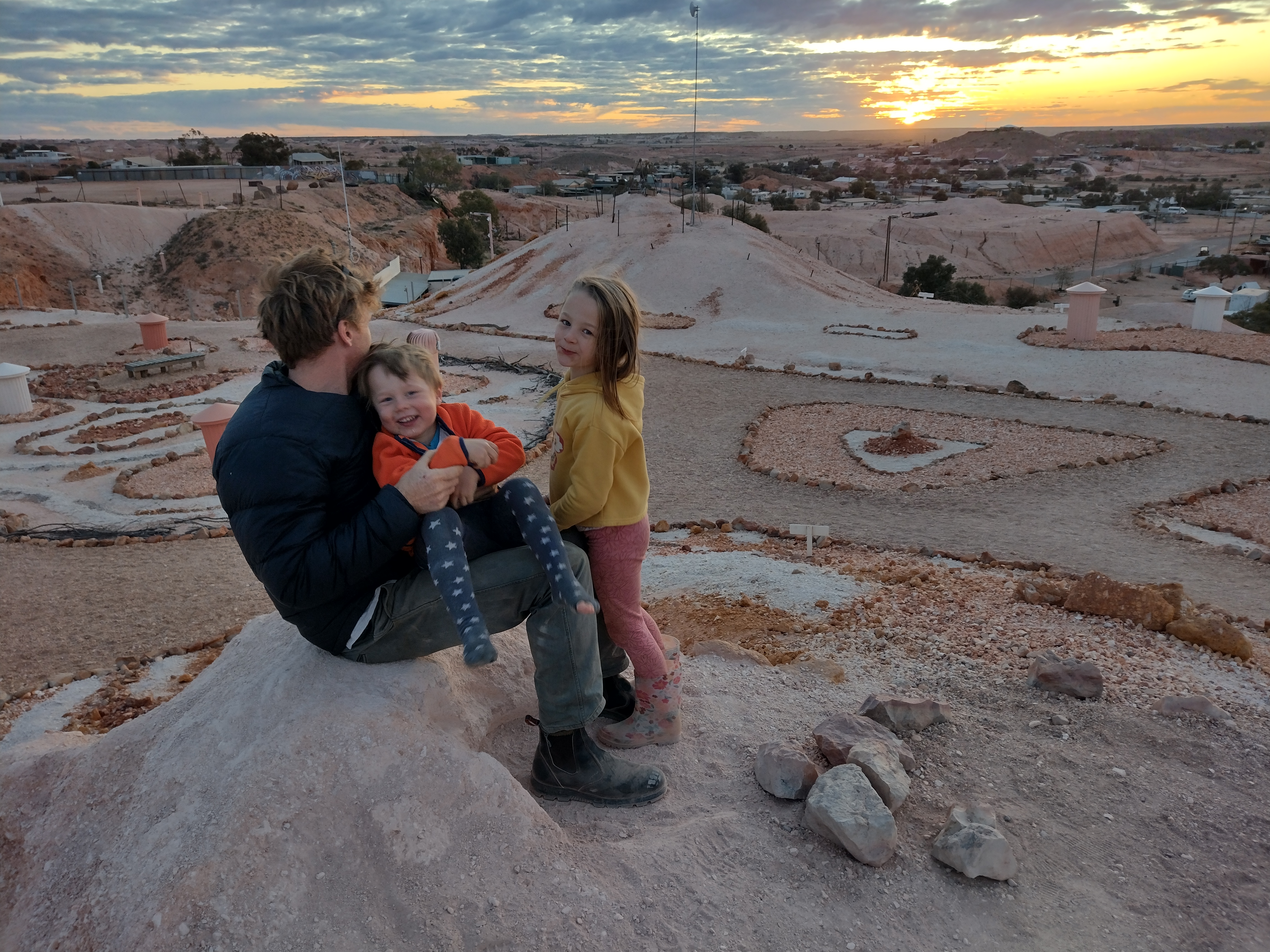 We arrived in Coober Pedy slightly worried about finding a spot to stay, given how many caravans left before us from Lake Hart! Luckily there were still a couple of sites at Old Timers Mine, a free camp in town. After setting up camp we went for a walk through the main street and checked out some galleries and opal places. Bonnie was especially excited to see an artist working on a painting at a gallery! It’s a fascinating place – on one hand an environmental disaster with the open mines littering the landscape across the region, but an interesting lifestyle- underground living, chasing the opal dream….!