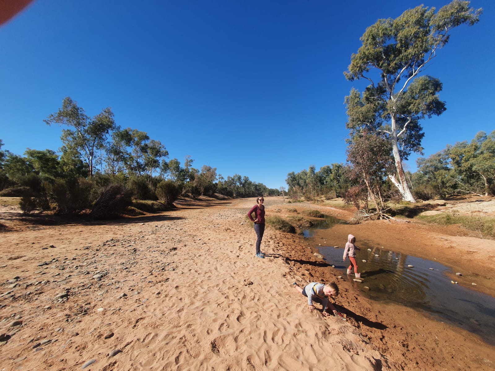We stopped at a roadside stop on the Finke River, a beautiful sandy expanse of riverbed and probably a great place to camp! The kids loved the giant sandpit and took some encouragement to leave! We pushed on to West MacDonnell Ranges, and Ellery Creek Big Hole. A stunning location that we have stayed at before as part of the Larapinta trail. Unfortunately I had a planning fail here, as we were meant to book. Not wanting to take someone else’s allocated site Richie rang Amelia with the satellite phone, and learnt the whole place is booked out. Some people there kindly offered to claim us as part of their group when the Rangers came in the morning, except they were leaving the next morning, and we didn’t want to risk having to pack and leave on the Rangers request, which apparently they had been doing. Amelia found a site available for 2 nights at serpentine chalet, 20km up the road. With the sun setting we jumped back into the car and drove there, straight into the setting sun.