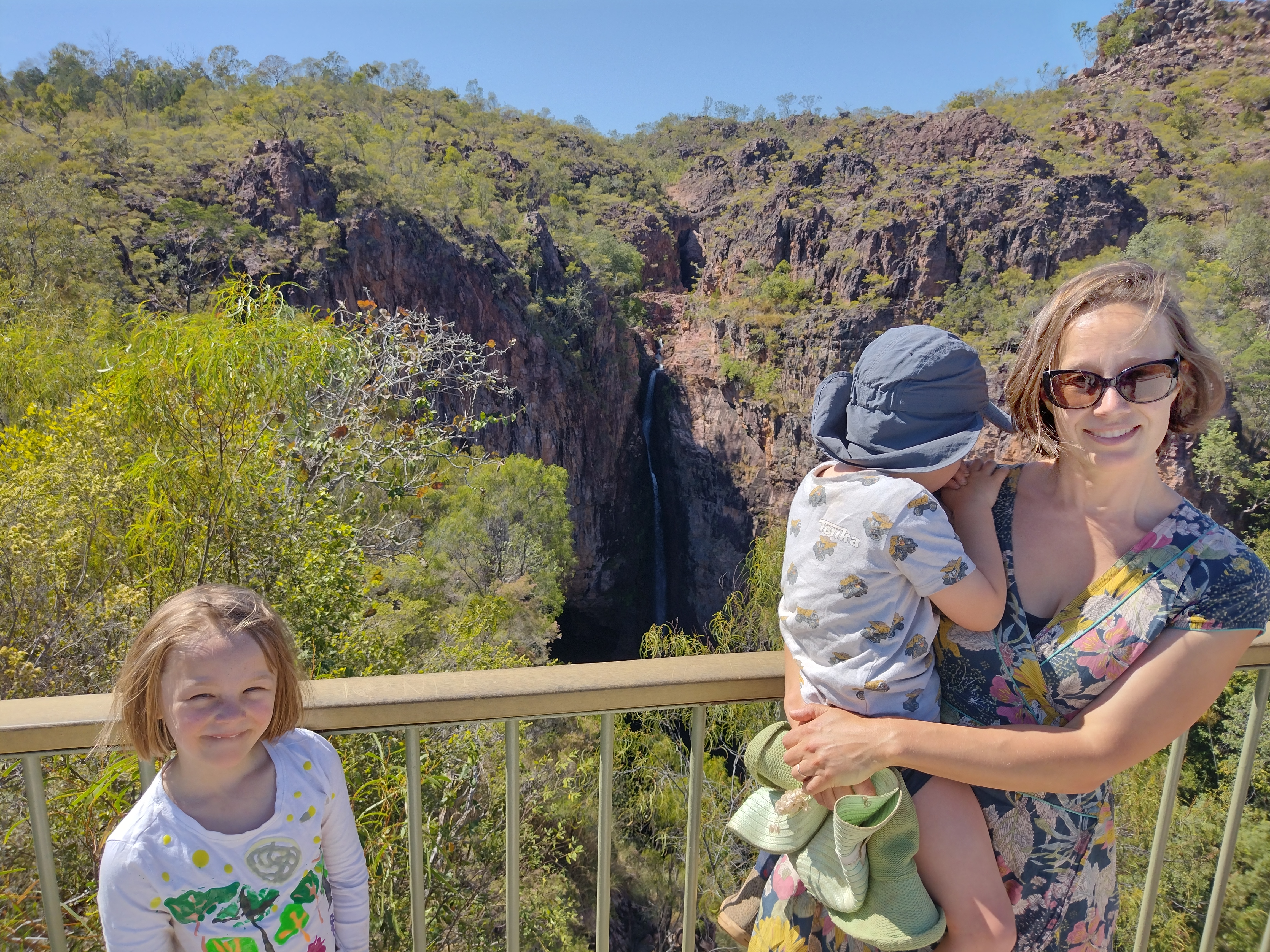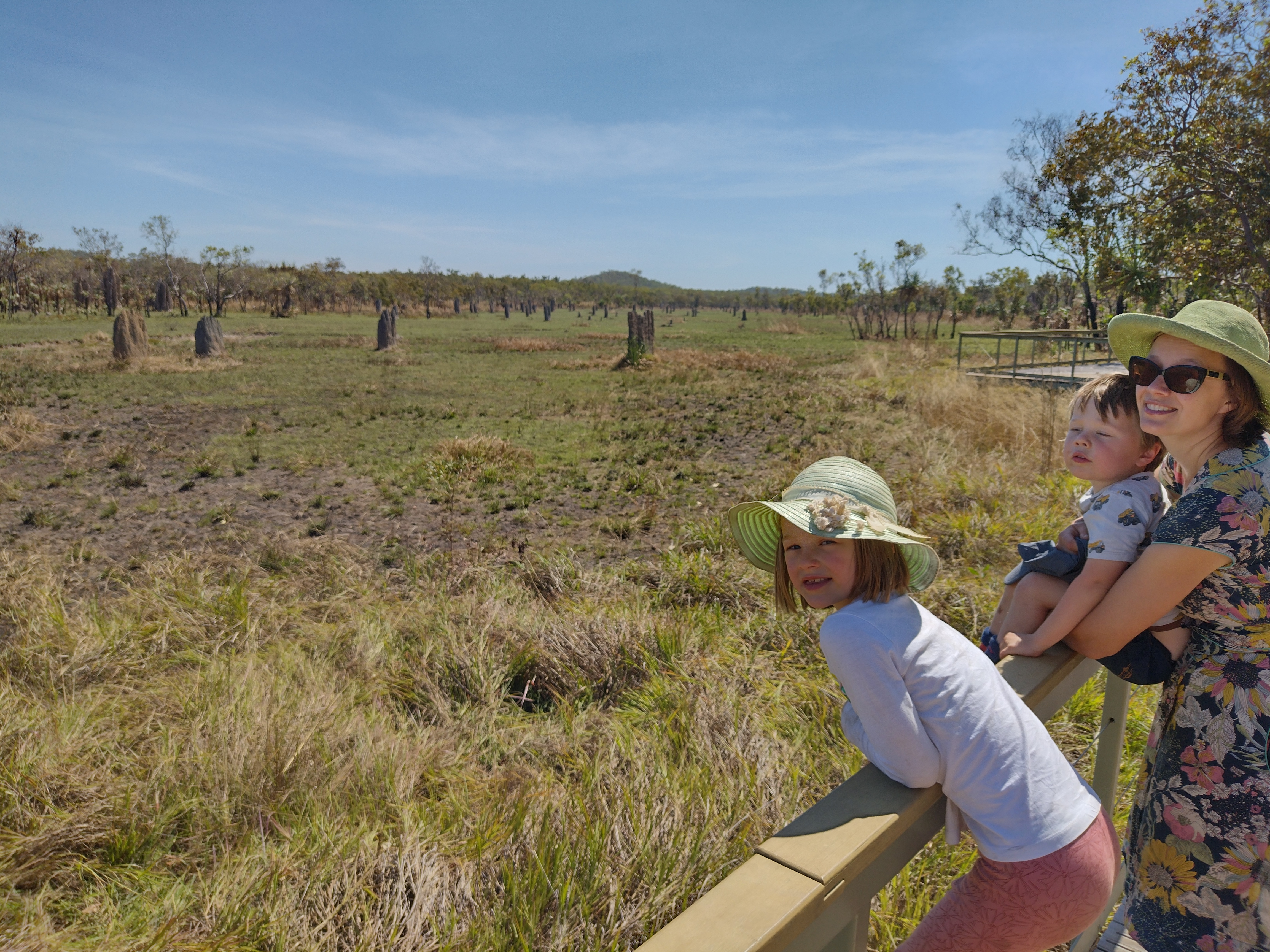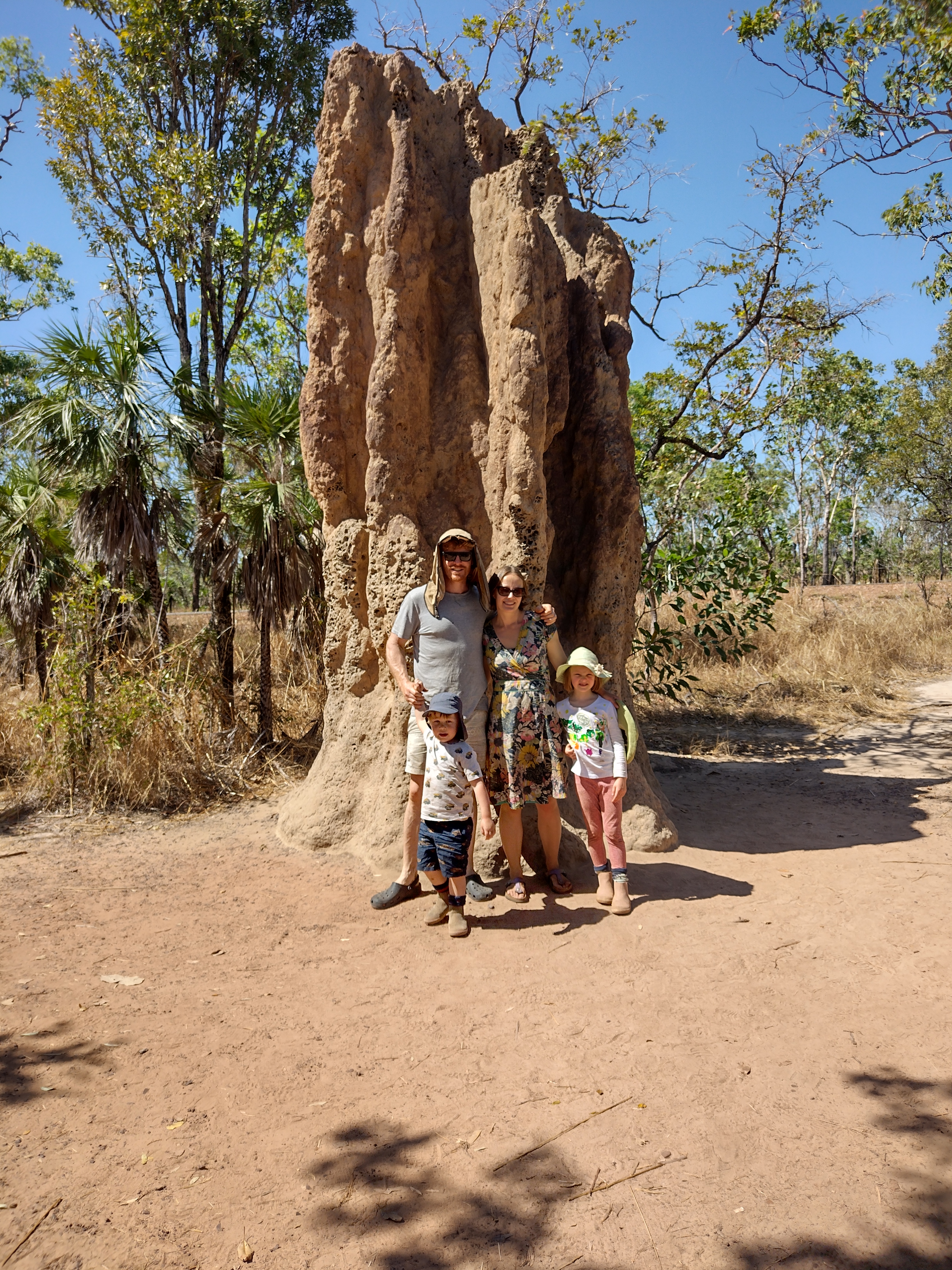 We had a bit of a sleep in this morning and woke up at 8! We packed up to leave by 10:45, a particularly late start, but we didn’t have far to go. We stopped off at Tolmer Falls lookout, which is beautiful, though the kids were both completely exhausted from a big day and a late night, so they weren’t feeling particularly keen on walking far. Next stop was the magnetic termite mounds. We felt like we had seen much better displays on the road to Sandy Creek Falls yesterday – particularly Richie when he and Andrew went to Reynolds River to fish, but it was good for the kids to see the interp signs, and we got the usual photos! After reading the signs all Otis wanted to do was try break a termite mound and see the soldier termites in action, though I’m not sure that was the desired effect of the signs!! 😆