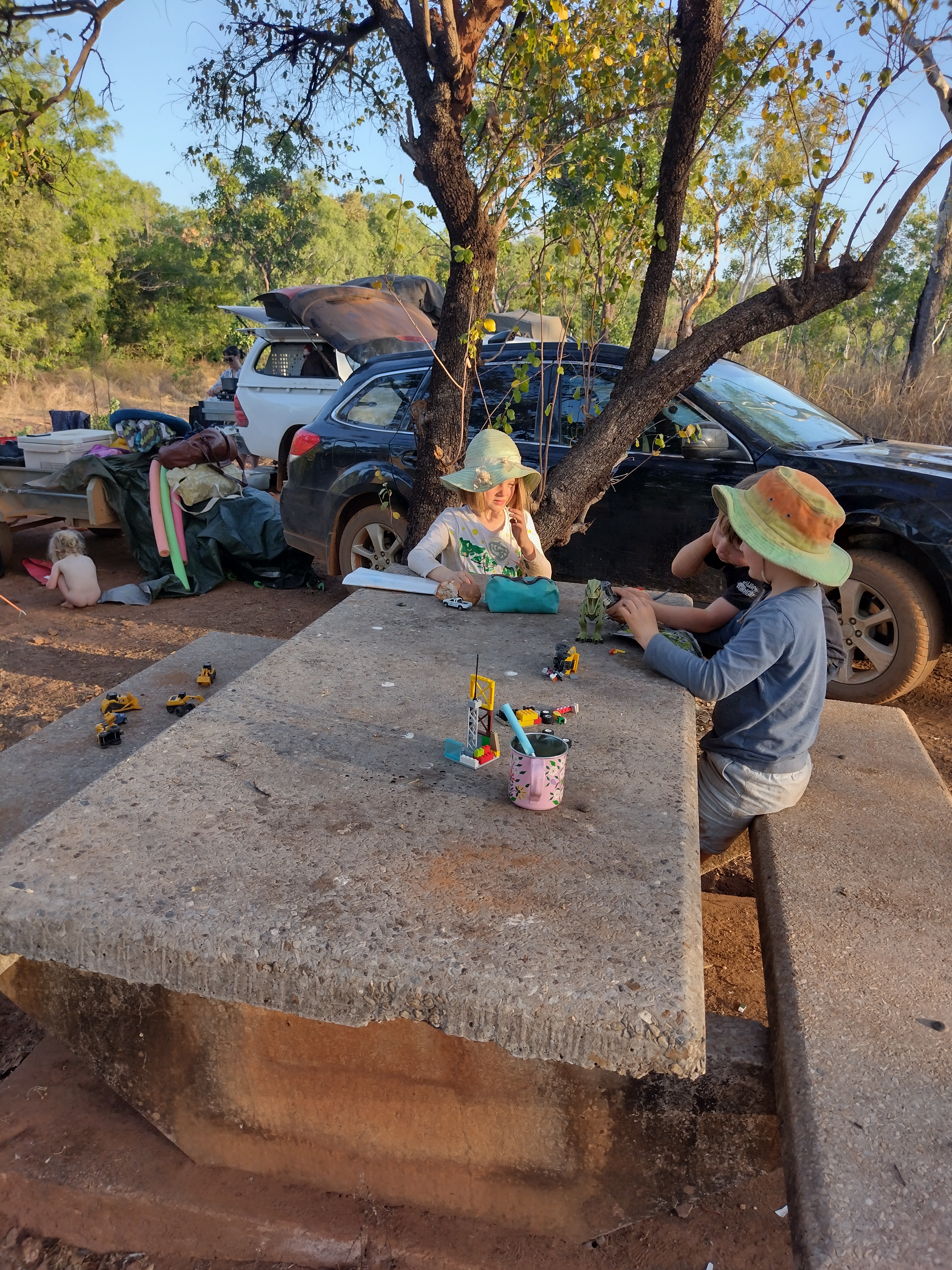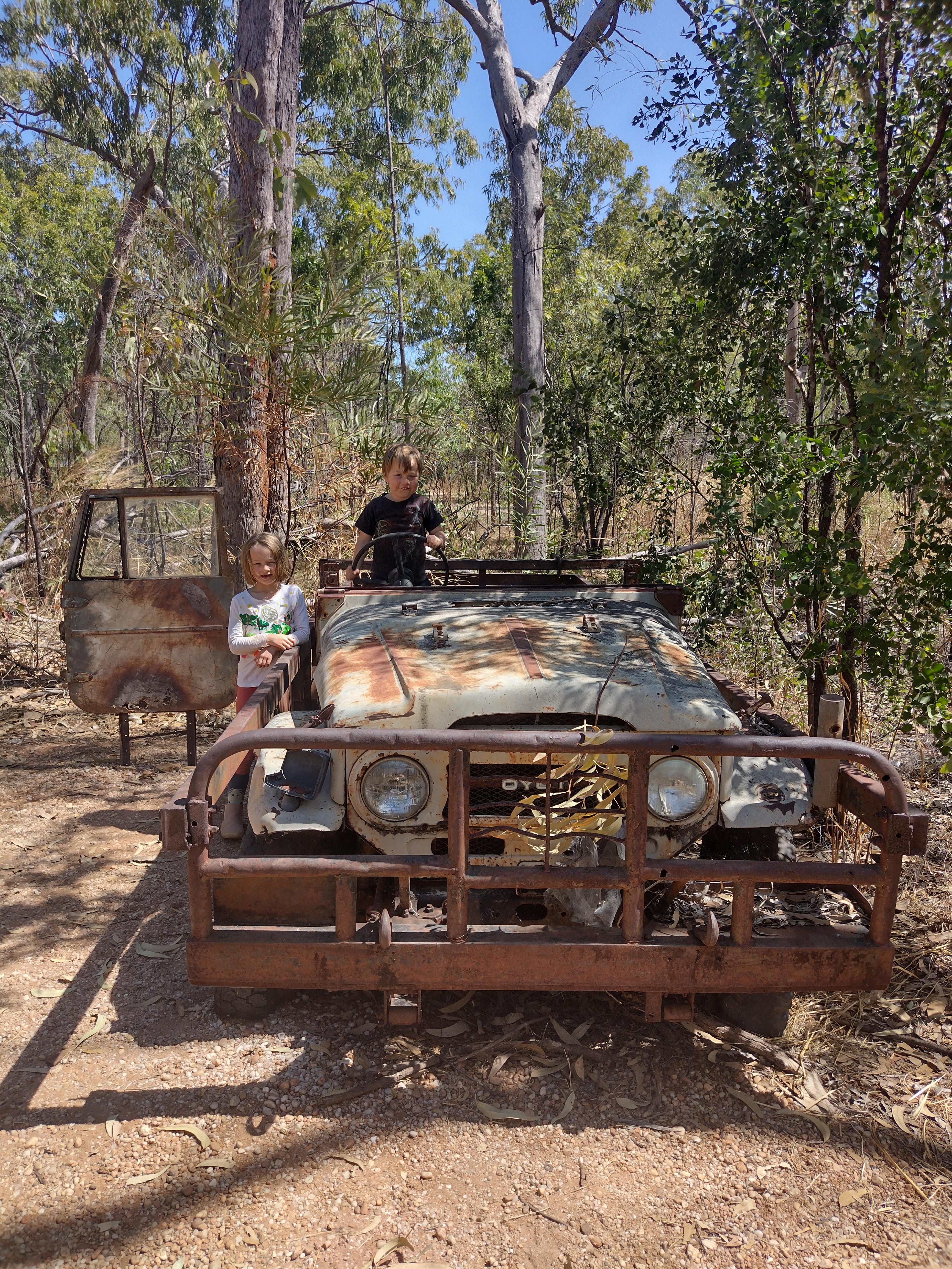 We headed on into Kakadu NP, stopping briefly at the info centre to buy a parks pass and admire an old ute – certainly Otis’ highlight! We turned off onto another heavily corrugated dirt track, and bounced on to get to our campsite – Kambolgie Creek. We arrived at 2pm, so everything was feeling very hot, dry and dusty! We picked the site that offered the most shade (and was also completely overrun with ants, but the shade won!), and set up camp. We did very little for a while after that, just trying to keep out of the sun! Richie went for a walk along the creek to check out fishing potential, while the kids did some drawing.