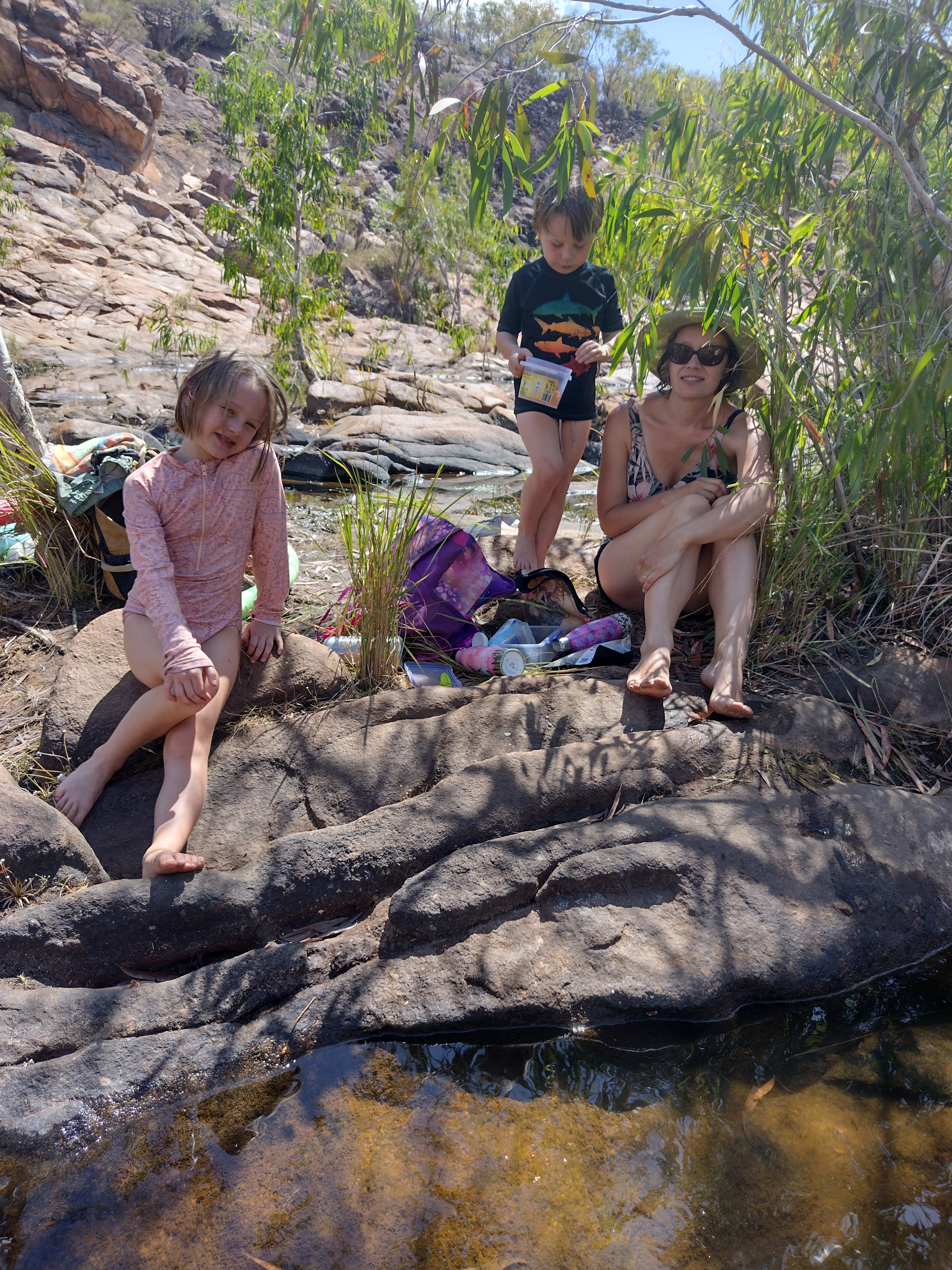 That was our hottest night camping by far! The night stayed hot and still until the early hours of the morning when it cooled down a little. The big disadvantage of being in a tent is that after a hot day, the ground stays hot, and you are effectively lying on an electric blanket all night long! 🥵 Years ago we camped at Kakadu during some hot weather – after not being able to sleep and going a little crazy we gave up and went to Litchfield instead, where for some reason it’s cooler at night. So after a terrible night’s sleep for everyone, Richie was talking either flying back home, or cutting the holiday short by using up our funds on an air conditioned unit somewhere! 😆😵💫 He really doesn’t like the heat! 🤪 The flies are also quite bad here, similar to Jabiru, and Bonnie in particular is annoyed by them. Luckily Antony and Jodes gifted us an extra Oz tent panel when we were in Melrose, which has been really handy for providing privacy for the “ensuite” when required, and also makes an excellent fly free zone outside of the tent!