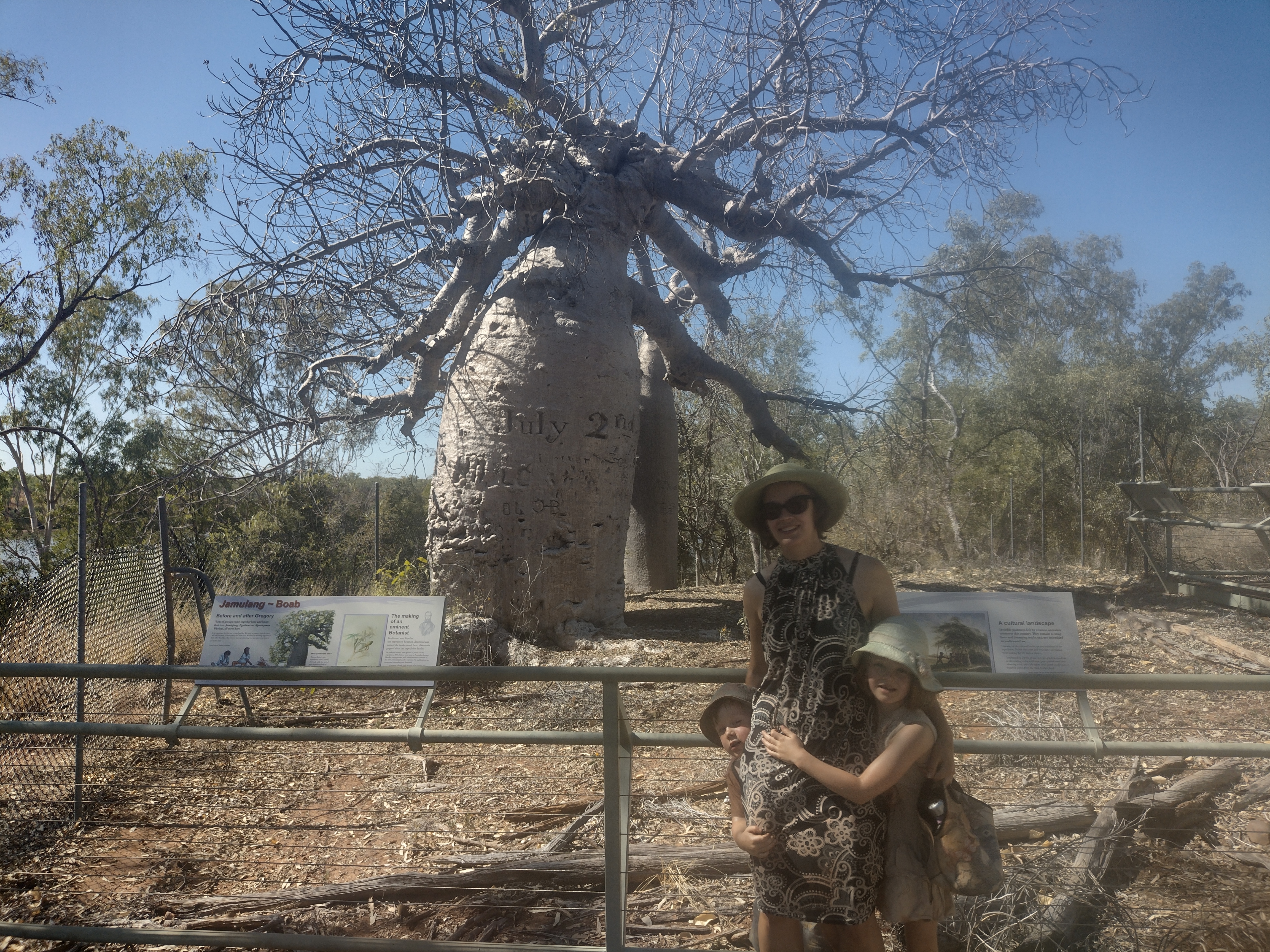 We stopped in nearby to see ‘Gregory’s tree’, which I misinterpreted to think it was a large boab that perhaps was used as a shelter for explorers. However it turned out to be a boab with a date carved in it in 1856 by Thomas Baines during an expedition with Augustus Gregory, which was not quite what I had talked it up to be to the kids! Had I realised I doubt we would have taken the corrugated detour to get there. Anyway we read a few signs about the base camp they set up while exploring the area, using the Victoria River to boat supplies in, and the indigenous significance of the area. It’s interesting to imagine the difficulties that must have been faced by those exploring these harsh regions.