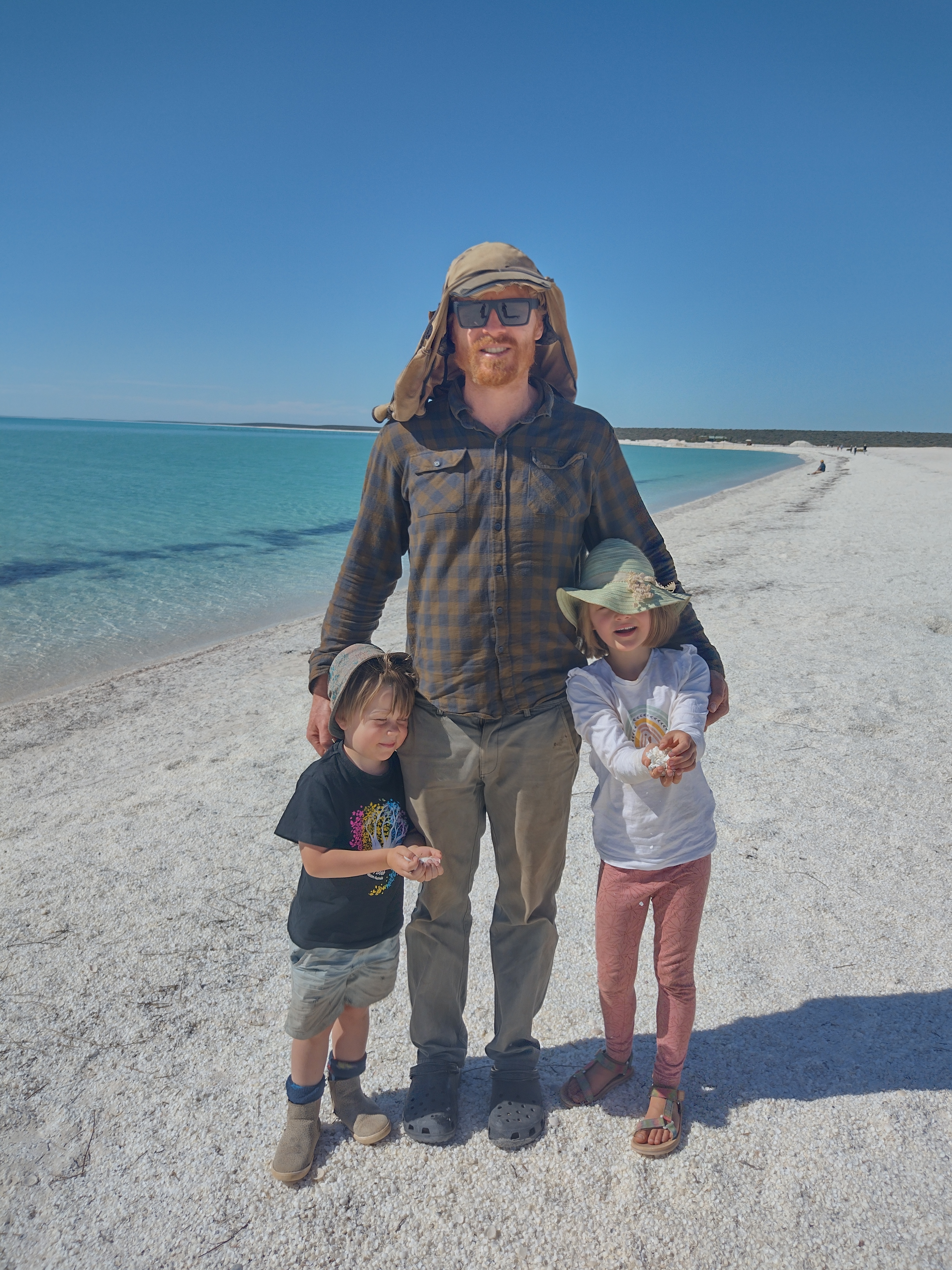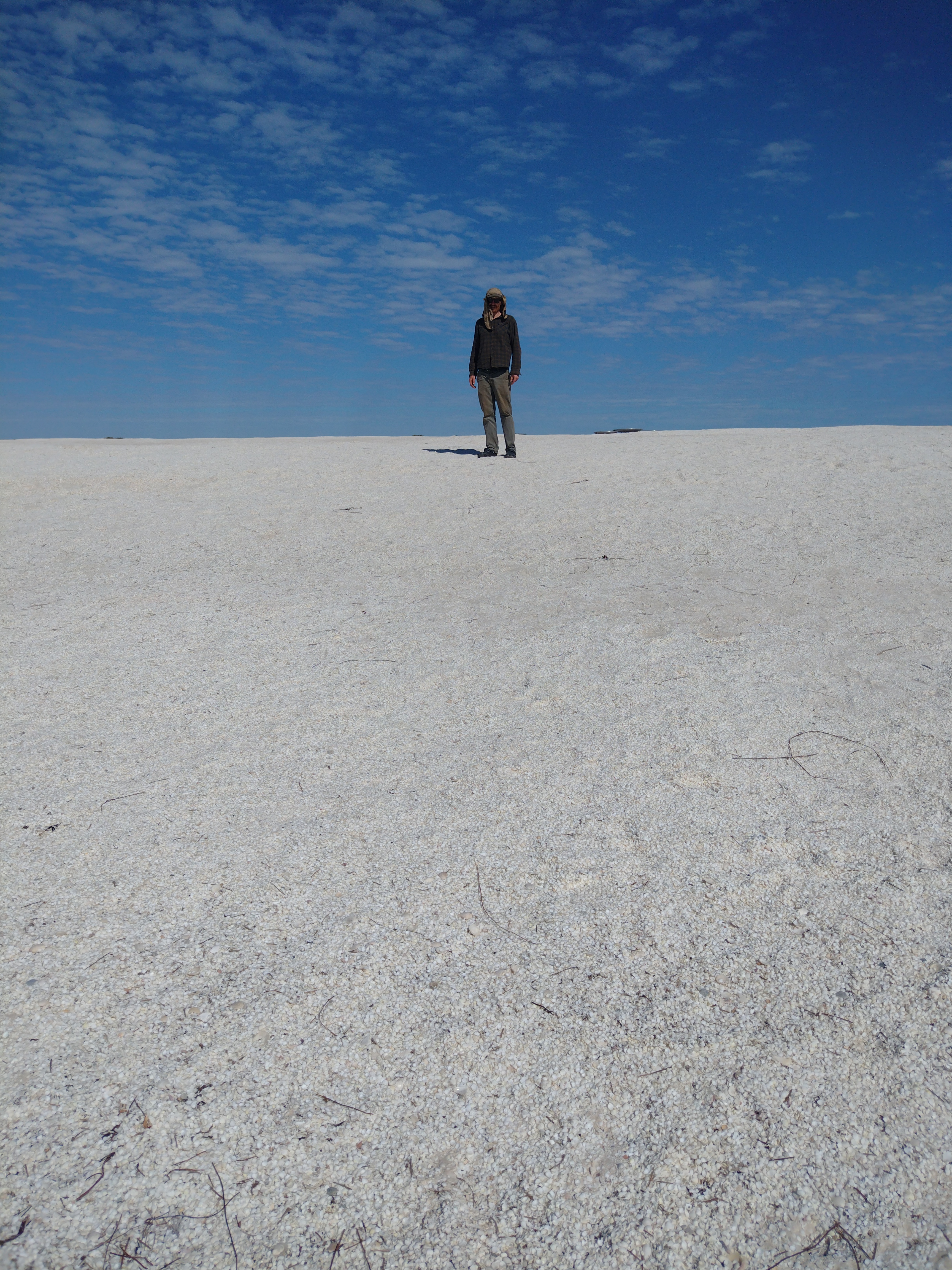 We pulled into Shell Beach, which is quite an amazing location – a blindingly white beach made up entirely of tiny cockle shells, apparently up to nine metres deep in parts! It is quarried in parts for coquina, the white stone that forms from the shells over time. Bonnie was thrilled to find a small piece of this as we looked around. The water looked amazing, and we were tempted to go in, though it is apparently much saltier than the ocean due to the sea grass preventing flow. Given we hadn’t showered for a few days, we were feeling salty enough and gave it a miss. I did tell Bonnie maybe on the way back out, though we might also forget about that! 😬