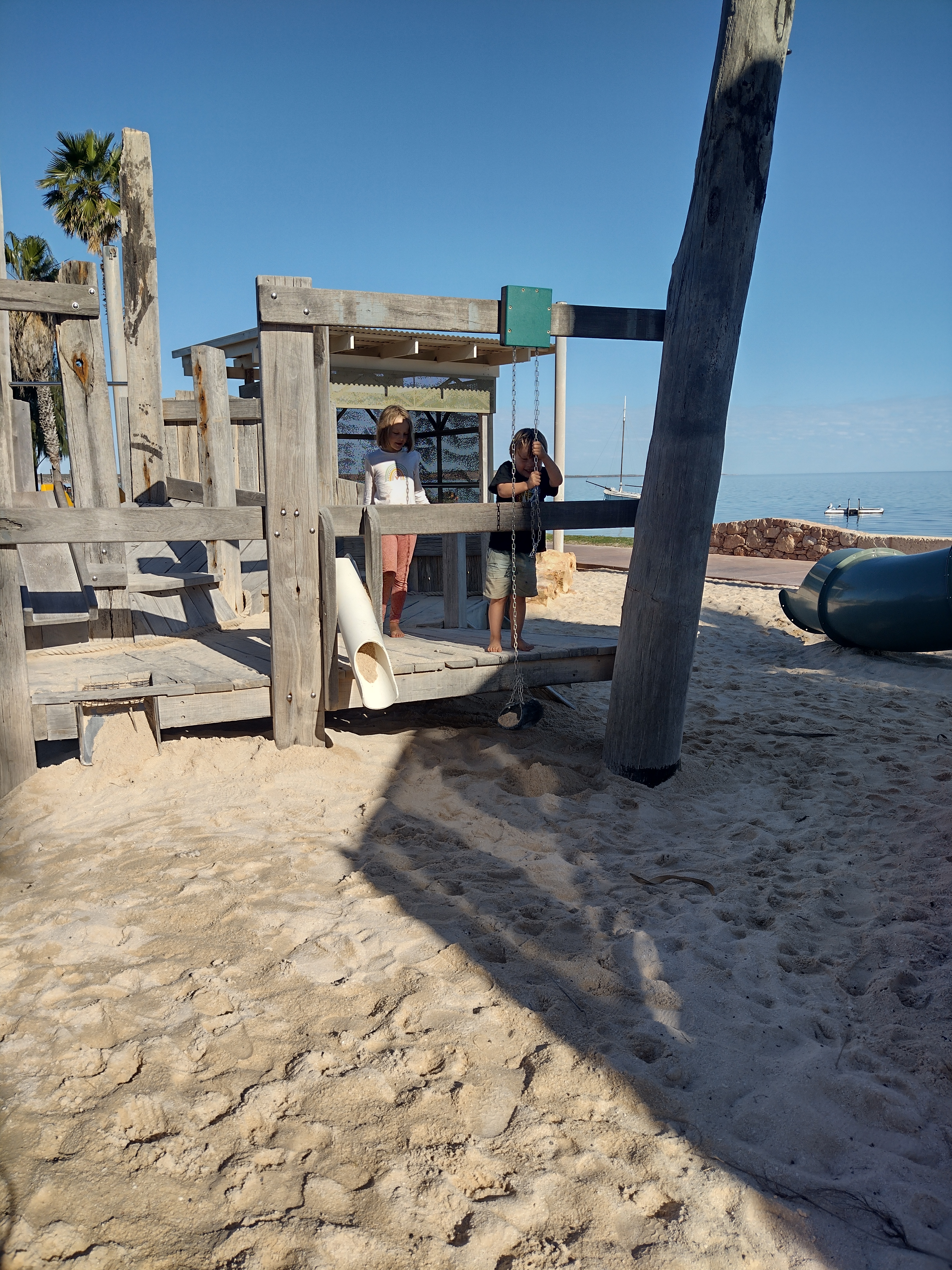 We drove into Denham, which is the most western town in Australia. It is a cute coastal village that has a really lovely feel to it, and a beautiful calm bay. I wish we had the Hobie here, it would be amazing! We did some shopping, though only limited, given price and availability. In hindsight it probably wasn’t the best idea to avoid Carnarvon, which would have had a bigger range at the shops! We picked up ice creams for the kids, and iced coffees for ourselves, and had a little stay at the waterfront playground, that has an awesome castle made out of the coquina bricks!